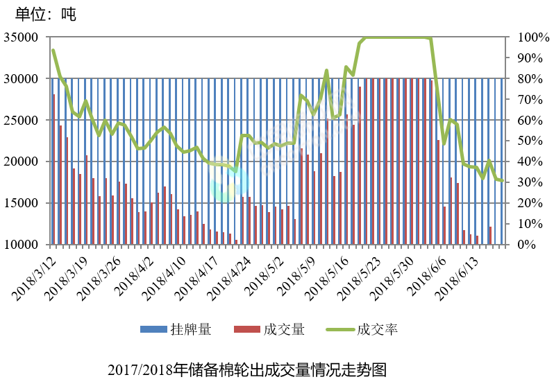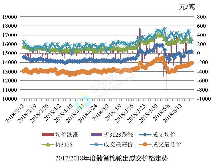 6月20日储备棉轮出销售资源30007.2585吨,实际成交9229.9792吨,成交率30.76%。平均成交价格15232元/吨(较前一日上涨51元/吨);折3128价格16625元/吨(较前一日上涨233元/吨)。