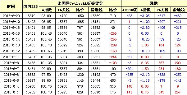 6月20日国际棉价继续大幅回调。Cotlook A指数报93.00美分/磅,跌395点,连续三日跌845点,跌幅8.3%。滑准税率折口岸价15669元,1%税率折口岸价14720元/吨,分别较前一日跌462和617元,两日累计分别下跌998元和1320元,跌幅分别达6%和8.2%。受外棉大幅下调,内外价差继续扩大,其中1%税率折口岸价低于国内1659元/吨,滑准税折口岸价低于国内710元/吨。