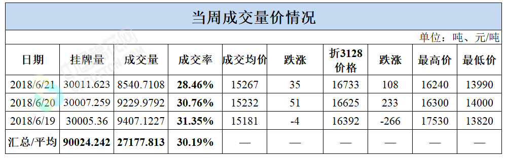 累计情况:截至6月21日,累计计划出库213万吨,累计出库成交130.8万吨,成交率为61%;成交最高价17700元/吨,最低价12700元/吨。