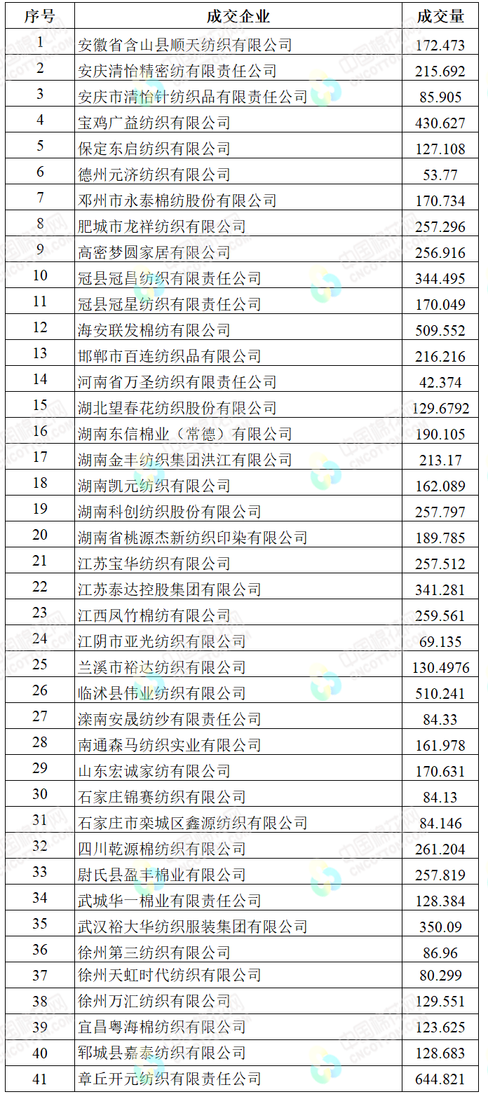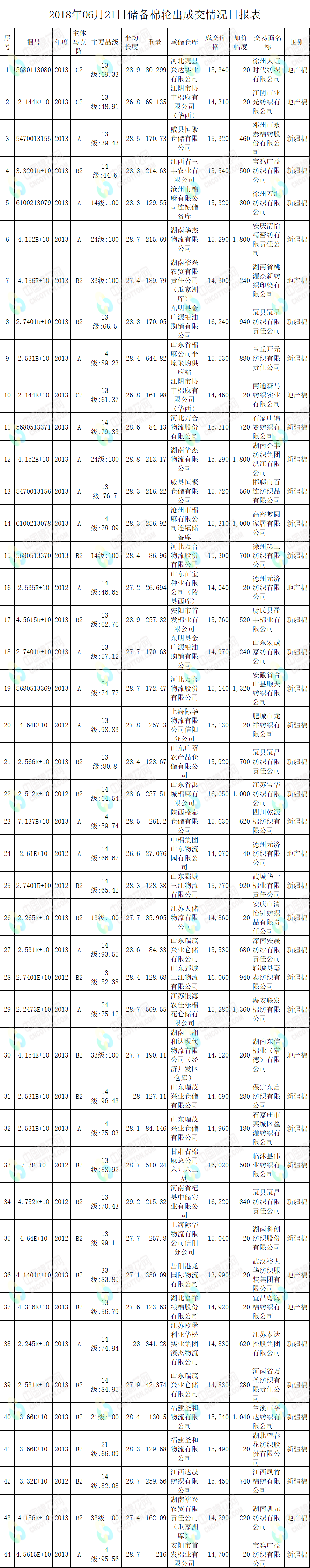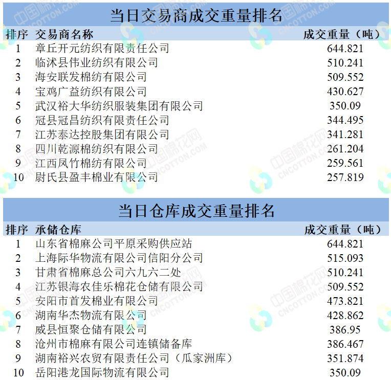 地产棉成交1380.876吨,成交率6.36%,成交均价14321元/吨,平均加价99元/吨,最高成交价15340元/吨,最低成交价13990元/吨;新疆棉成交7159.8348吨,成交率86.40%,成交均价15450元/吨,平均加价733元/吨,最高成交价16240元/吨,最低成交价14690元/吨。
