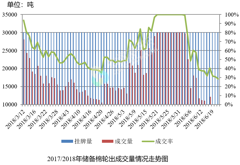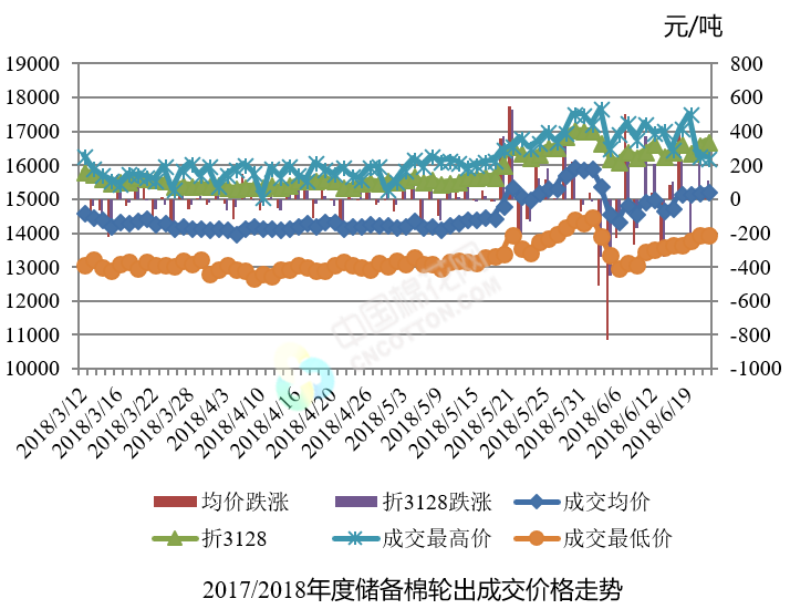 6月21日储备棉轮出销售资源30011.623吨,实际成交8540.7108吨,成交率28.46%。平均成交价格15267元/吨(较前一日上涨35元/吨);折3128价格16733元/吨(较前一日上涨108元/吨)。