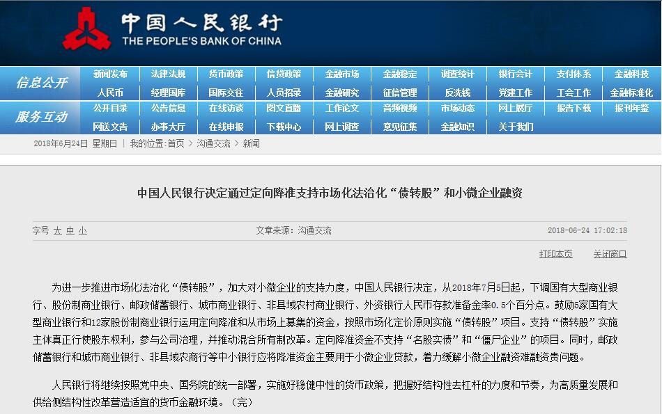 为进一步推进市场化法治化“债转股”,加大对小微企业的支持力度,中国人民银行决定,从2018年7月5日起,下调国有大型商业银行、股份制商业银行、邮政储蓄银行、城市商业银行、非县域农村商业银行、外资银行人民币存款准备金率0.5个百分点。鼓励5家国有大型商业银行和12家股份制商业银行运用定向降准和从市场上募集的资金,按照市场化定价原则实施“债转股”项目。支持“债转股”实施主体真正行使股东权利,参与公司治理,并推动混合所有制改革。定向降准资金不支持“名股实债”和“僵尸企业”的项目。同时,邮政储蓄银行和城市商业银行、非县域农商行等中小银行应将降准资金主要用于小微企业贷款,着力缓解小微企业融资难融资贵问题。