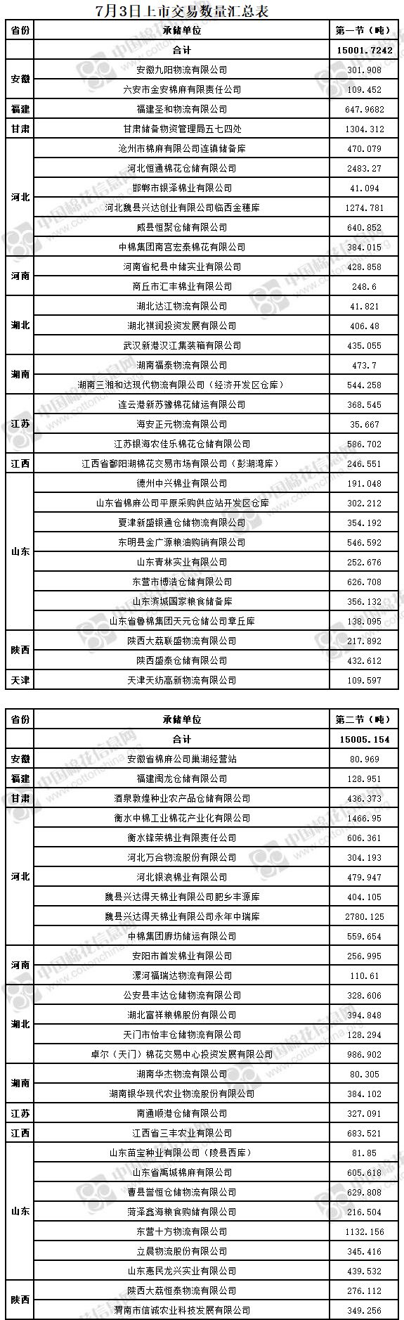 7月3日两节共计轮出储备棉30006.2802吨。第一节销售储备棉15001.7242吨,其中需要倒垛出库68捆。第二节销售储备棉15005.154吨,其中需要倒垛出库76捆。