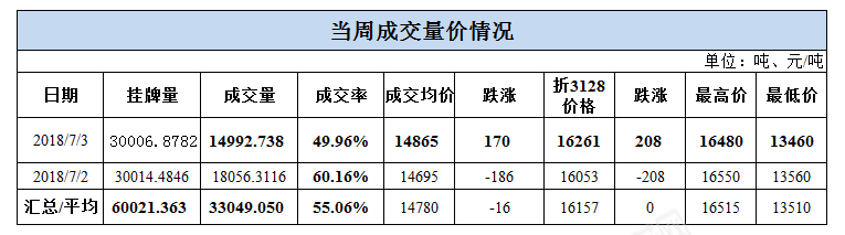 累计情况:截至7月3日,累计计划出库237万吨,累计出库成交143.2万吨,成交率为60.4%;成交最高价17700元/吨,最低价12700元/吨。