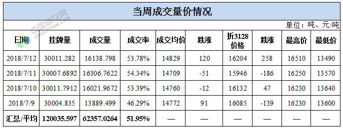 累计情况:截至7月12日,累计计划出库258万吨,累计出库成交154.1万吨,成交率为60%;成交最高价17700元/吨,最低价12700元/吨。