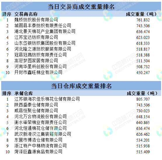 地产棉成交6428.009吨,成交率31.66%,成交均价14306元/吨,平均加价362元/吨,最高成交价15580元/吨,最低成交价13490元/吨;新疆棉成交9710.789吨,成交率100%,成交均价15175元/吨,平均加价955元/吨,最高成交价16510元/吨,最低成交价14310元/吨。