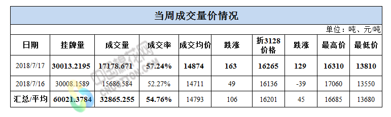 累计情况:截至7月17日,累计计划出库267万吨,累计出库成交159.3万吨,成交率为59.7%;成交最高价17700元/吨,最低价12700元/吨。