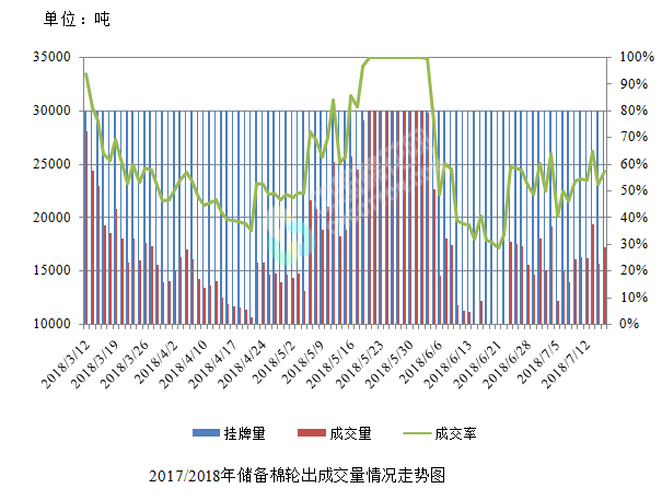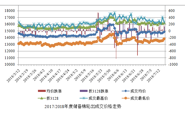 7月17日储备棉轮出销售资源30013.2195吨,实际成交17178.671吨,成交率57.24%。平均成交价格14874元/吨(较前一日上涨163元/吨);折3128价格16265元/吨(较前一日上涨129元/吨)。