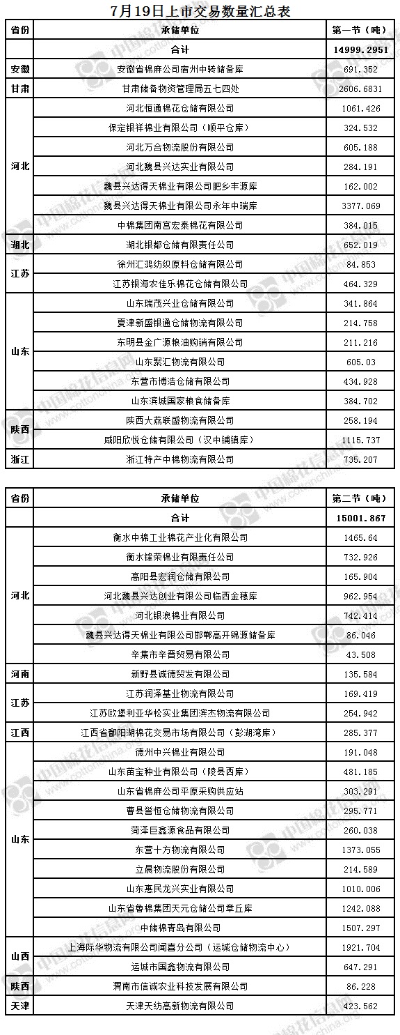 7月19日两节共计轮出储备棉30001.1621吨。第一节销售储备棉14999.2951吨,其中需要倒垛出库72捆。第二节销售储备棉15001.867吨,其中需要倒垛出库87捆。