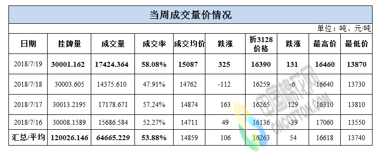累计情况:截至7月19日,累计计划出库273万吨,累计出库成交162.4万吨,成交率为59.5%;成交最高价17700元/吨,最低价12700元/吨。