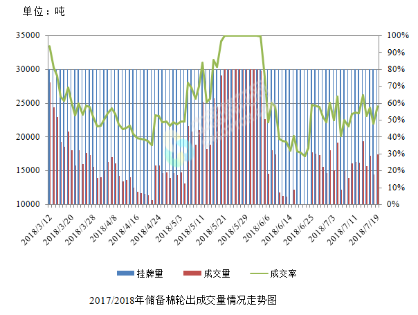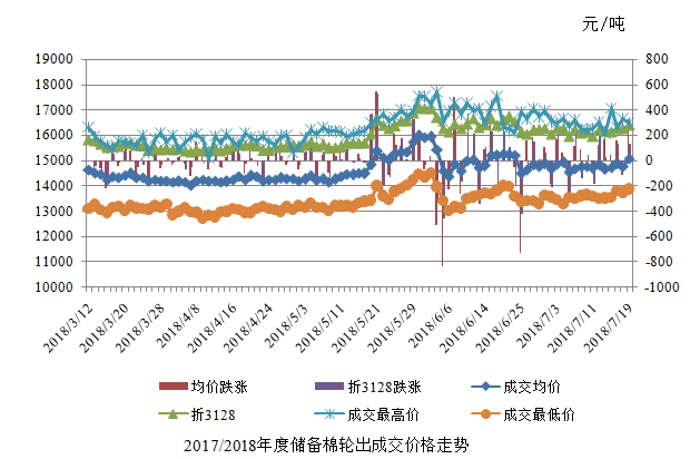7月19日储备棉轮出销售资源30001.1621吨,实际成交17424.3641吨,成交率58.08%。平均成交价格15087元/吨(较前一日上涨325元/吨);折3128价格16390元/吨(较前一日上涨131元/吨)。