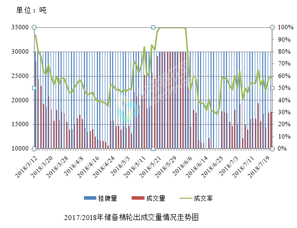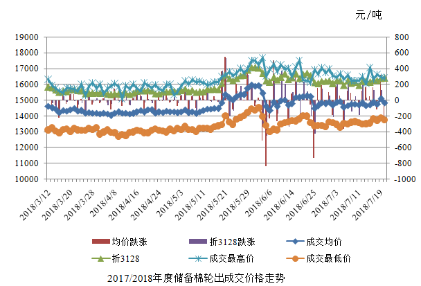 7月20日储备棉轮出销售资源30008.7327吨,实际成交17620.7917吨,成交率58.72%。平均成交价格14856元/吨(较前一日下跌231元/吨);折3128价格16399元/吨(较前一日上涨9元/吨)。