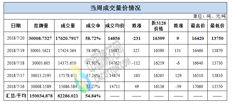 累计情况:截至7月20日,累计计划出库276万吨,累计出库成交164.2万吨,成交率为59.5%;成交最高价17700元/吨,最低价12700元/吨。