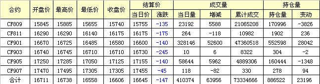 7月23日,隔夜郑棉盘整,今日早盘在空头卖盘打压下回落,此后低位震荡,日线形成小阴线。日内成交量放大,持仓量增加。基本面情况:阿勒泰地区大部、博州部分、伊犁州东部部分、石河子市部分偏低,全疆其余大部偏高;降水阿勒泰地区部分、伊犁州大部偏多,全疆其余大部偏少;日照时数北疆大部偏少,全疆其余大部偏多。旬内,全疆棉花处于花铃期,吐鲁番市东坎棉花开始裂铃。本旬气象条件对大部地区农作物生长发育较为有利,但持续高温天气对南疆东疆部分地区棉花花铃生长有不利影响。