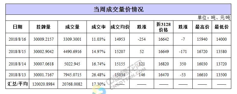 累计情况:截至8月16日,累计计划出库333.1万吨,累计出库成交189.6万吨,成交率为56.92%;成交最高价17700元/吨,最低价12700元/吨。