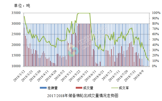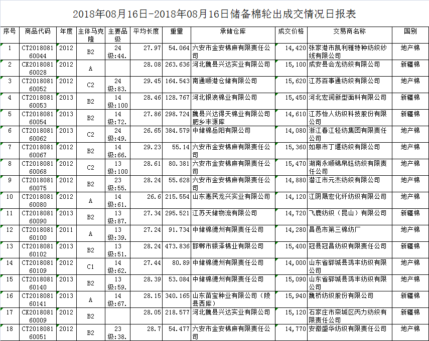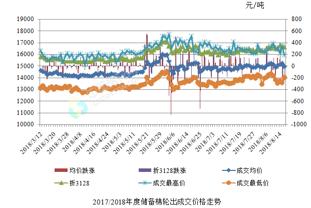 8月16日储备棉轮出销售资源30009.2157吨,实际成交3309.3001吨,成交率11.03%。平均成交价格14953元/吨(较前一日下跌254元/吨);折3128价格16642元/吨(较前一日下跌7元/吨)。