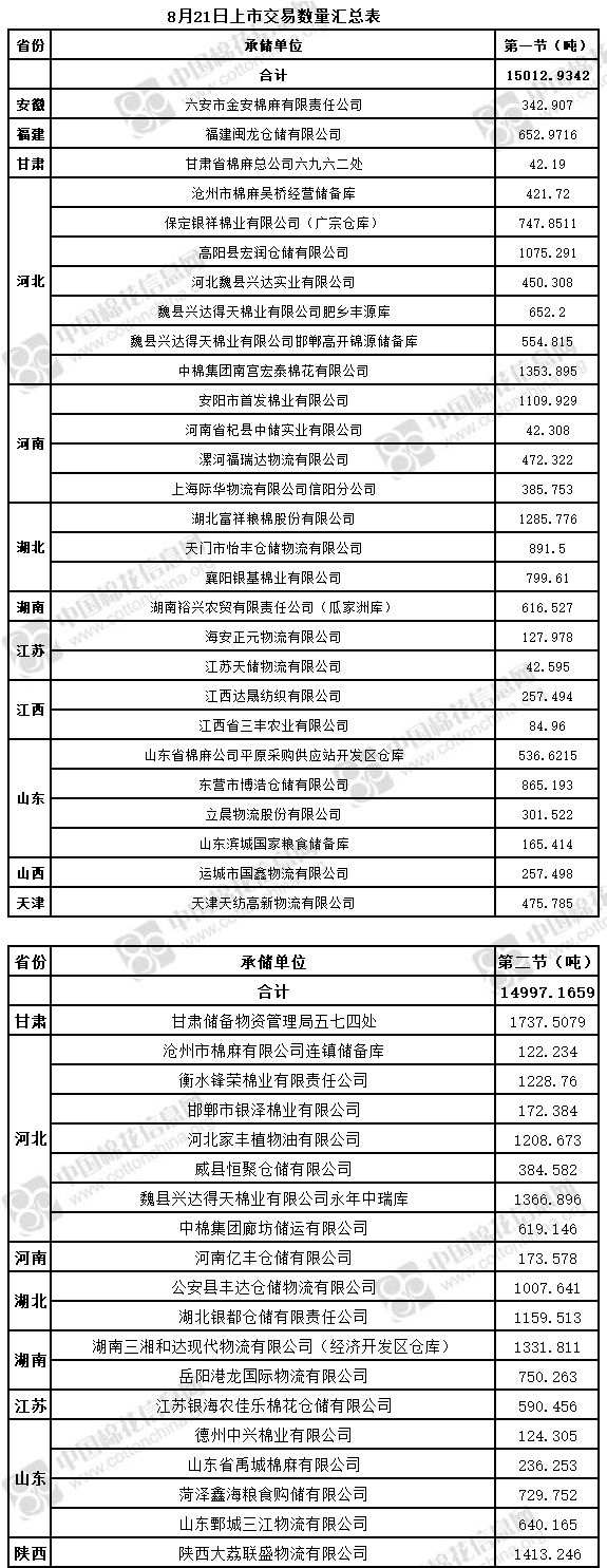 8月21日两节共计轮出储备棉30010.1001吨。第一节销售储备棉15012.9342吨,其中需要倒垛出库92捆。第二节销售储备棉14997.1659吨,其中需要倒垛出库65捆。