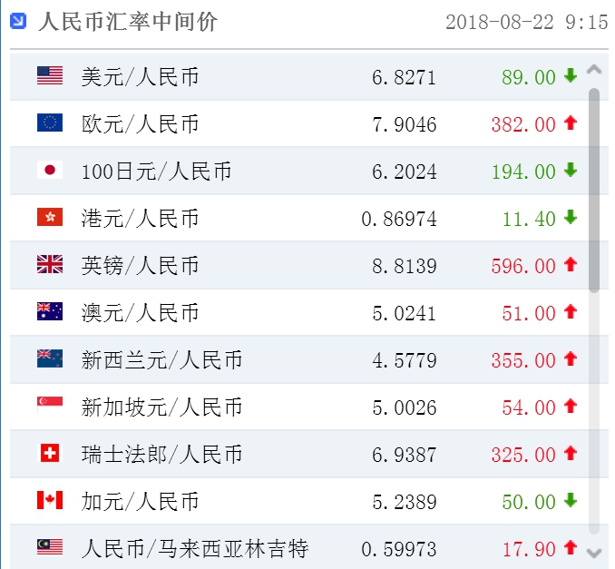 中国外汇交易中心22日公布数据显示,人民币对美元汇率中间价报6.8271,较前一交易日上调89个基点,创8月2日以来新高,且为连续第四个交易日调升。