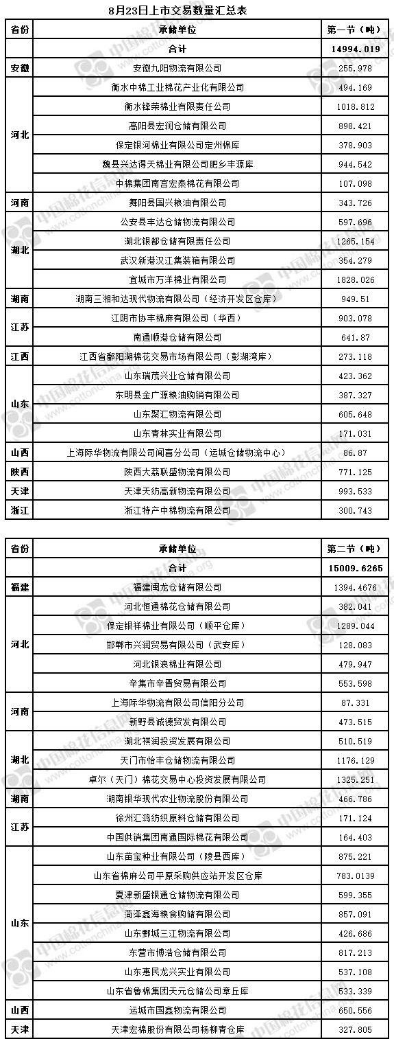 8月23日两节共计轮出储备棉30003.6455吨。第一节销售储备棉14994.019吨,其中需要倒垛出库86捆。第二节销售储备棉15009.6265吨,其中需要倒垛出库86捆。
