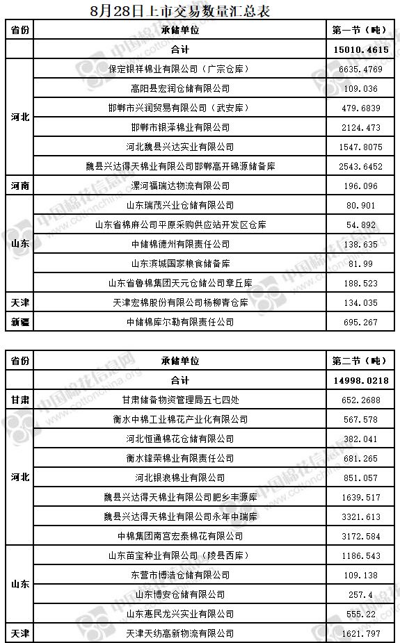 8月28日两节共计轮出储备棉30008.4833吨。第一节销售储备棉15010.4615吨,其中需要倒垛出库58捆。第二节销售储备棉14998.0218吨,其中需要倒垛出库67捆。