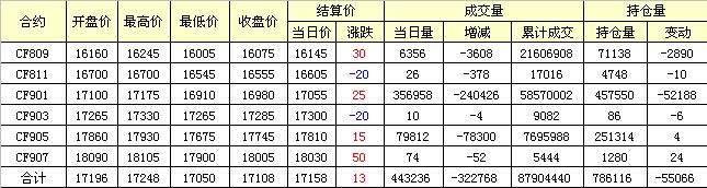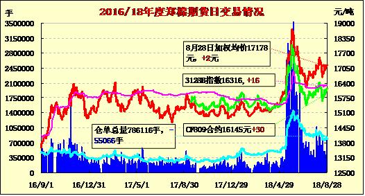 8月28日隔夜郑棉宽幅震荡,今日早盘在多头平仓盘压制下回落,随后在空头回补推动下脱离低点,尾盘调整,日线形成阴线。日内成交量萎缩,持仓量减少。基本面情况:8月28日至31日,全疆有大范围降水降温天气,伊犁州、博州、喀什地区、和田地区、哈密市等局地累计雨量大。目前,南疆部分棉区棉花裂铃,吐鲁番市大部棉花吐絮,全疆其余棉区棉花处于花铃生长期。预计此次降水降温天气对部分棉花的花铃生长及品质有不利影响。