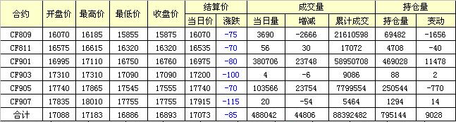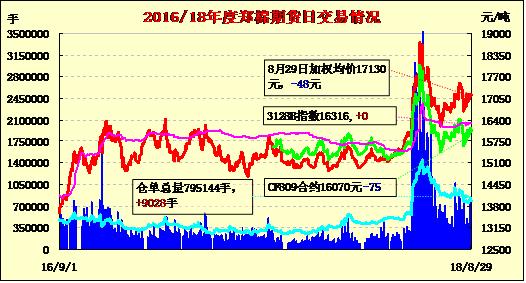 8月29日隔夜郑棉盘整,今日早盘维持震荡格局,尾盘放量下跌,日线形成阴线。日内成交量放大,持仓量增加。基本面情况:上周末澳大利亚新南威尔士和昆士兰降雨不尽人意,远远未能缓解持续已久的旱情。据澳大利亚气象部门,周末降雨最大的地区在圣乔治,降雨量在95mm,但降雨最少的地区降雨量不足10mm。澳大利亚东部和南部今年上半年都经历了较严重的干旱,并预计在未来三个月内都不能得到缓解,目前100%的新南威尔士和57.4%昆士兰都被宣布为干旱。