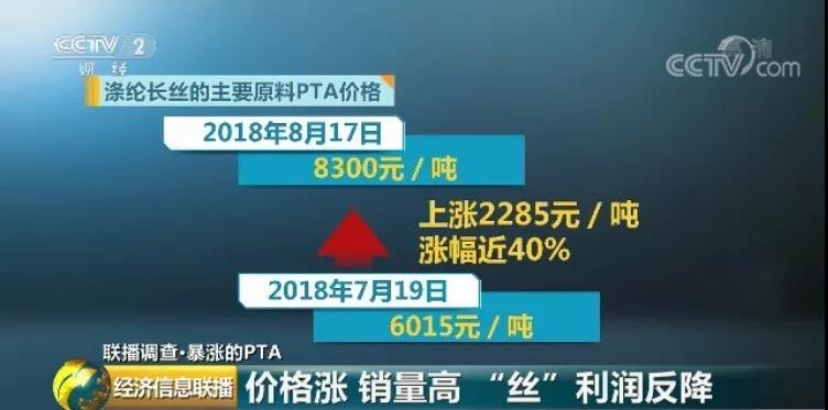 虽产品量价齐升,但生产涤纶长丝利润却在大幅下降。在桐昆集团,记者拿到一份工厂原料价格表。上面显示,涤纶长丝主要原料PTA价格,7月19日6015元/吨,到8月17日上涨到8300元/吨。不到一月时间,PTA价格上涨2285元/吨,涨幅已接近40%。