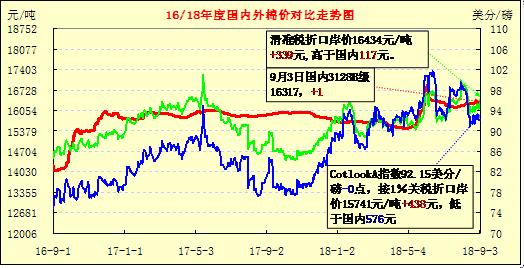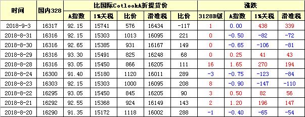 9月3日因汇率贬值,折口岸价大幅度提升。9月3日,Cotlook A指数92.15美分/磅,与前一交易日持平。9月份计算口岸价汇率为6.8856,较8月份的6.6914下降2.9%。按此汇率,9月3日滑准税率折口岸价为16434元,1%税率折口岸价15741元/吨,分别较昨日涨339元和438元。内外价差:1%税率折口岸价低于国内576元/吨,滑准税折口岸价高于国内117元/吨。