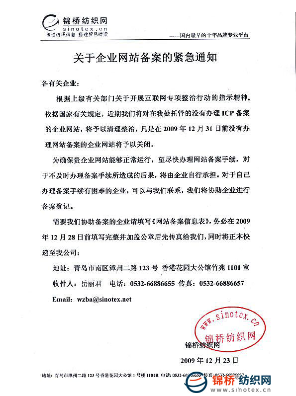 需要我们协助备案的企业请填写《网站备案信息表》,务必在2009年12月28日前填写完整并加盖公章后先传真给我们,同时将正本快递至我公司: