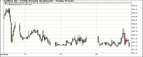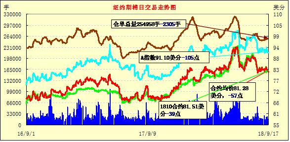 17日纽约期棉市场全面收跌。1812合约结算价81.31美分,跌52点;1903合约结算价81.64美分,跌50点;1905合约结算价82.20美分,跌44点。其他合约下跌13-39点不等。当日12月合约小幅高开,开盘后在81.30-81.80美分区间震荡运行,后低点处买盘发力,交易重心受支撑走高,高点处受获利了结盘压力市场下行,后至收盘处维持震荡态势,最终以小幅下跌收盘。目前飓风Florence强度已减弱至热带风暴,其造成的影响或将在10月份美国农业部(USDA)数据调整中有所体现。上周末期间印度主产棉区迎来有利降雨。2017/18年度印度棉出口数据良好,但由于印度卢比持续贬值,印度棉价格相对较低。外围美元指数下跌,玉米、小麦和大豆期货下跌。