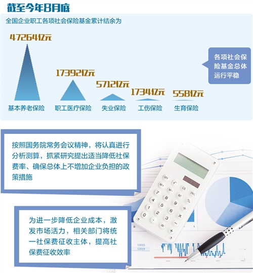 社保费率如进一步降低,是否会影响到社保基金运行?从各项社保基金运行情况看,截至今年8月底,全国企业职工基本养老保险、职工医疗保险、失业保险、工伤保险、生育保险基金累计结余分别为47264亿元、17392亿元、5712亿元、1734亿元、558亿元,各项社会保险基金总体运行平稳。