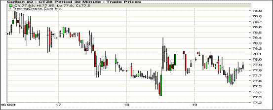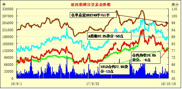 10月19日纽约期棉市场全面收跌。1812合约结算价77.92美分,跌13点;1903合约结算价79.36美分,跌13点;1905合约结算价80.45美分,跌10点。其他合约下跌6-14点。当日12月合约小幅高开,开盘后呈震荡运行态势,因缺乏有利支撑,交易重心走低,至当日低点77.52美分处买盘发力,市场受支撑上行,但因上涨动力不足,最终以小幅下跌收盘。根据美国农业部最新发布的美棉出口数据,上周签约和装运量均出现明显减少。同时,中美贸易争端尚未出现缓和趋势,引发市场担忧。外围美元指数下跌,大豆和玉米期货下跌,小麦期货涨跌互现。美股周五收盘涨跌不一,道指收涨,标普和纳指收跌。