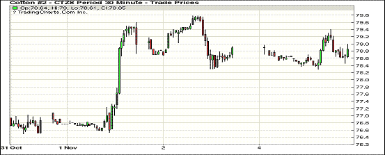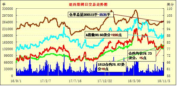 10月5日纽约期棉市场近涨远跌。1812合约结算价78.87美分,涨8点;1903合约结算价80.34美分,涨3点;1905合约结算价81.63美分,涨7点。当日12月合约小幅高开,因缺乏有力支撑开盘后交易重心下行,至当日低点78.29美分处买盘发力,市场受支撑走高。后受获利了结盘压力交易重心再度回落,至收盘处在买盘支撑之下市场出现回弹,最终扭转跌势,以微幅上涨收盘。美国时间本周二将进行中期选举,在选举结果出炉之前,市场普遍观望。本周美国农业部(USDA)将发布最新的供需平衡表,市场普遍预期美棉总产将有所下调。据悉,大型多头基金继续12至3月移仓。外围美元指数下跌,大豆和小麦期货下跌,玉米期货上涨。周一美股收盘涨跌不一,道指和标普收涨,纳指收跌。