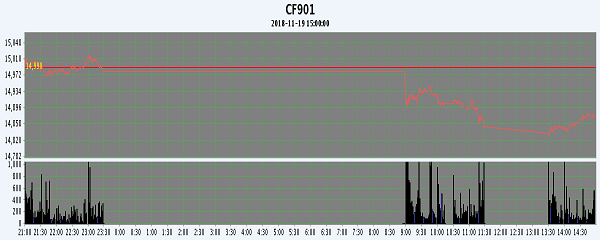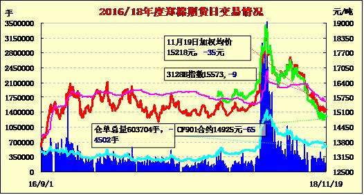 11月19日,隔夜郑棉下试回升,今日早盘受外盘冲高乏力的影响放量回落,午后减仓收低,日线形成小阴线。日内成交量萎缩,持仓量近减远增。基本面情况:2018年11月12日-11月18日,据全国棉花交易市场库对库新疆核查点统计,公路出疆棉运输量总计2.61万吨,较前一周运输量增加0.09万吨,同比减少2.0万吨。期间公路运输量略有回升,周内运价稳中有涨,部分路线运价小幅上涨。奎屯运至河南省平均运价约764元/吨,较前一周运价基本持平;奎屯运至山东省平均运价约815元/吨,较前一周运价上涨26元/吨;库尔勒运至河南省平均运价约771元/吨,较前一周运价上涨42元/吨,库尔勒运至山东省平均运价约791元/吨,较前一周运价上涨14元/吨。
