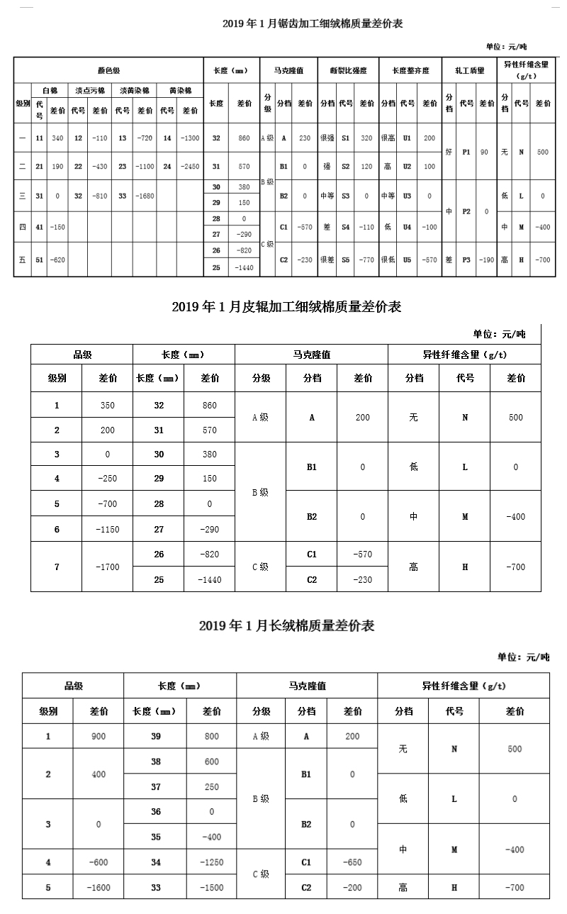 根据《中国棉花协会国产棉质量差价表管理办法》规定,现正式发布2019年1月《锯齿加工细绒棉质量差价表》、《皮辊加工细绒棉质量差价表》和《长绒棉质量差价表》(单位:元/吨)。