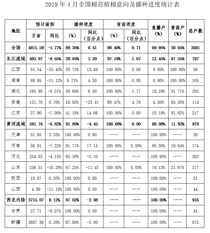 2019年4月,中国棉花协会棉农分会对全国12个省和新疆自治区共2681个定点农户进行第四次2019年植棉意向调查。结果显示:全国植棉意向面积4815.59万亩,同比下降1.77%,较上期回升1.58个百分点。其中新疆棉农种植意向同比上涨0.2%,较上期回升2.1个百分点;黄河流域、长江流域同比下降分别6.82%、8.65%,均与上期预测持平。