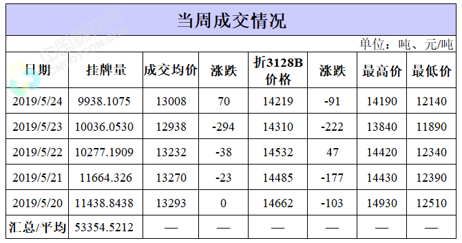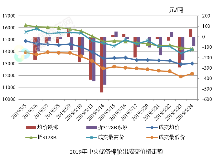 当周,储备棉轮出成交均价13164元/吨,较前周下跌405元/吨,折标准级(3128B)价格14459元/吨,较前周下跌499元/吨;其中新疆棉成交均价13518元/吨,较前周下跌427元/吨,平均加价728元/吨,较前周上涨36元/吨;地产棉成交均价12819元/吨,较前周下跌443元/吨,平均加价407元/吨,较前周上涨90元/吨;最高成交价14930元/吨,最低成交价11890元/吨。