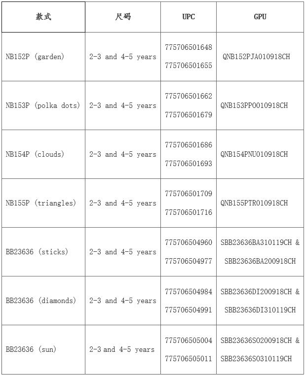 此次召回产品为PerlimpinpinInc.的两款睡袋款儿童睡衣。一款外层由100%聚酯纤维制成,双层内衬由65%聚酯纤维和35%棉制成。另一款由70%竹制人造丝和30%棉制成。具体召回产品信息如下: