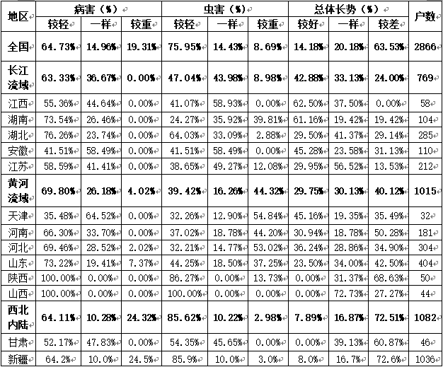 黄河流域棉区高温少雨,棉田墒情不足,无灌溉条件的地区出现不同程度的旱情,对棉苗苗期生长较为不利。截止到5月底,该流域棉花播(移栽)种工作全面完成,棉苗长势不旺,处第4-5真叶期的占总面积的43.38%,同比减少9.44个百分点;有灌溉条件的棉花长势较好,已处第6、8真叶期,干旱缺水的棉田仅有两片真叶。总体病害较轻,虫害较重。其中病害较轻的占69.8%,同比减少11.65个百分点;虫害发生较重占总面积的44.32%,同比增加34.28个百分点,主要是蚜虫和红蜘蛛,盲蝽蟓和蓟马较轻发生。苗情较好的占29.75%,同比下降12.99个百分点。