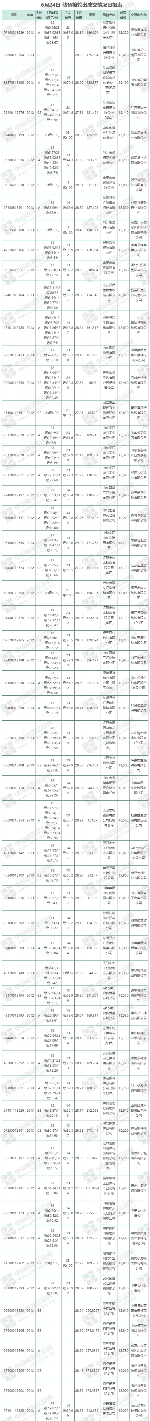 6月24日储备棉轮出销售资源10117.3171吨,实际成交10117.3171吨,成交率100.00%,成交均价12943元/吨,较21日上涨32元/吨;折3128价格14078元/吨,较21日上涨28元/吨。