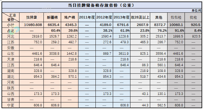 2.当日轮出上市储备棉中有部分为分批抽样公检。抽样比率及抽样方法按照棉花国家标准规定,品质指标包括颜色级、轧工质量、长度、马克隆值、断裂比强度、长度整齐度指标;重量采用原入库公检结果,不再重新检验。