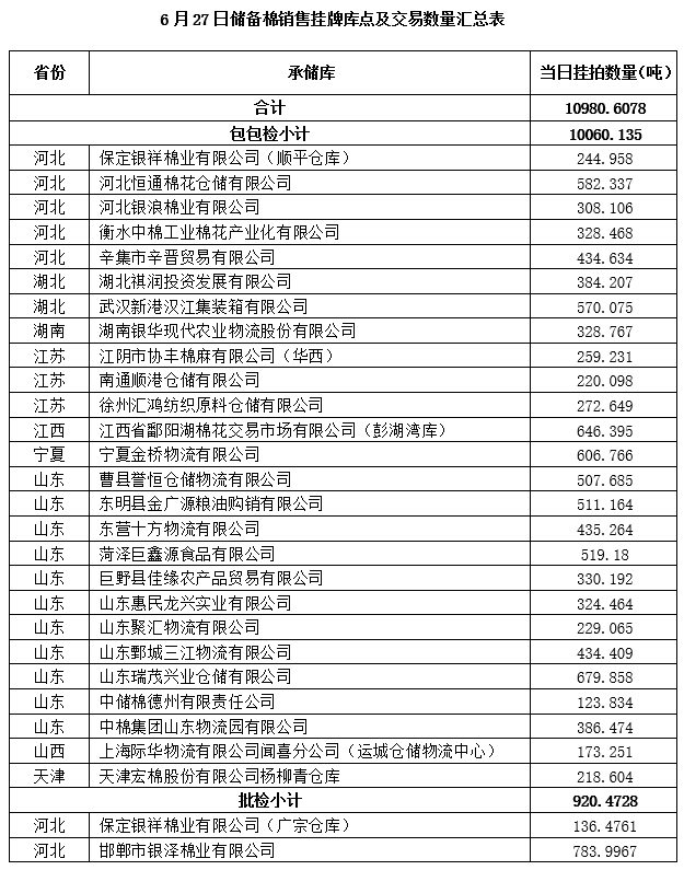 中国储备棉管理有限公司定于6月27日上市销售储备棉重量10980.6078吨,共70捆。