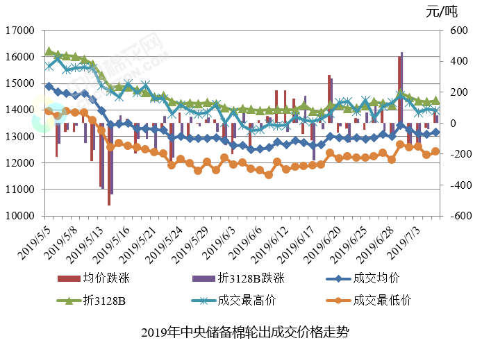 当周,储备棉轮出成交均价13198元/吨,较前周上涨224元/吨,折标准级(3128B)价格14417元/吨,较前周上涨226元/吨。其中新疆棉成交均价13370元/吨,较前周上涨187元/吨,折3128B价格14592元/吨,较前周上涨222元/吨,平均加价1100元/吨,较前周上涨245元/吨;地产棉成交均价12949元/吨,较前周上涨243元/吨,折3128B价格14162元/吨,较前周上涨202元/吨,平均加价670元/吨,较前周上涨225元/吨。当周,储备棉最高成交价14540元/吨,最低成交价12280元/吨。