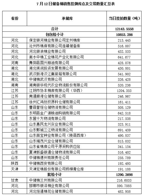 中国储备棉管理有限公司定于7月12日上市销售储备棉重量12143.5558吨,共68捆。