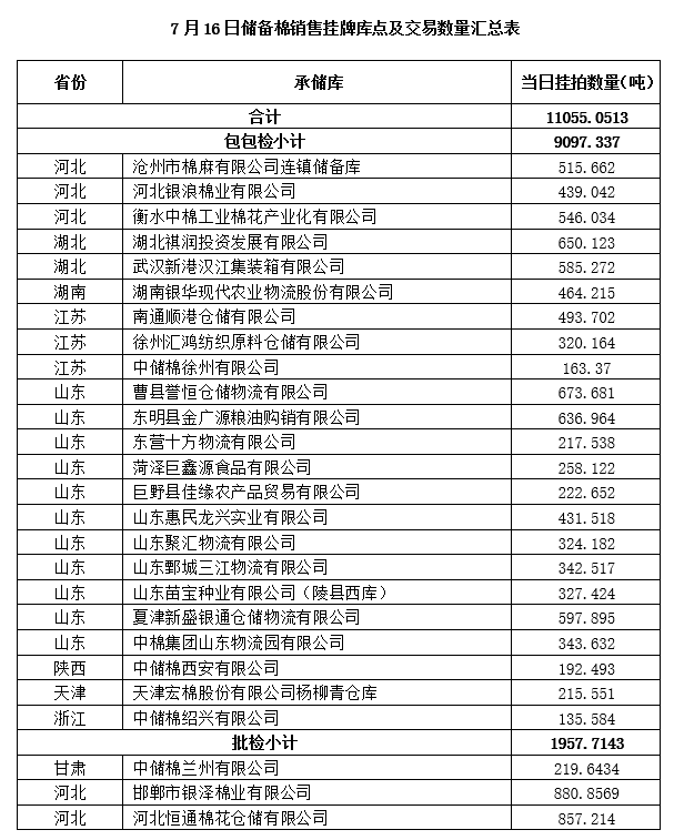 中国储备棉管理有限公司定于7月16日上市销售储备棉重量11055.0513吨,共62捆。