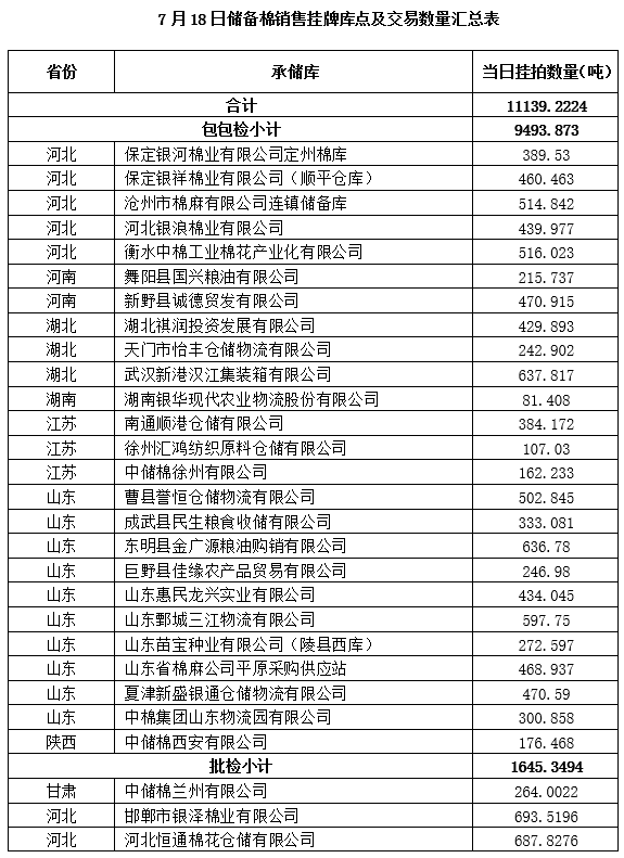 中国储备棉管理有限公司定于7月18日上市销售储备棉重量11139.2224吨,共62捆。