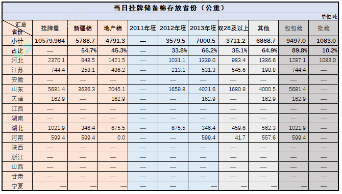 2.当日轮出上市储备棉中有部分为分批抽样公检。抽样比率及抽样方法按照棉花国家标准规定,品质指标包括颜色级、轧工质量、长度、马克隆值、断裂比强度、长度整齐度指标;重量采用原入库公检结果,不再重新检验。