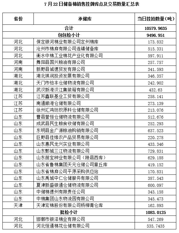 中国储备棉管理有限公司定于7月22日上市销售储备棉重量10579.9635吨,共63捆。
