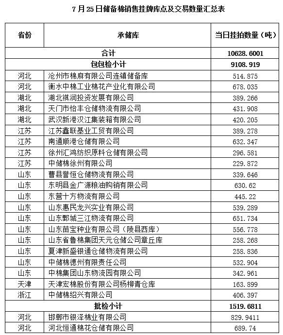 中国储备棉管理有限公司定于7月25日上市销售储备棉重量10628.6001吨,共57捆。
