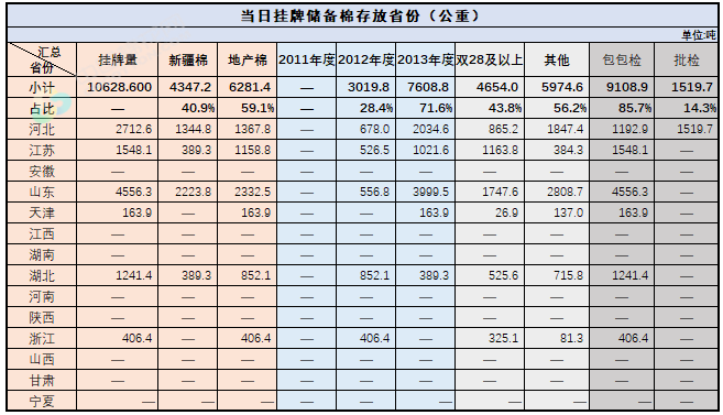 2.当日轮出上市储备棉中有部分为分批抽样公检。抽样比率及抽样方法按照棉花国家标准规定,品质指标包括颜色级、轧工质量、长度、马克隆值、断裂比强度、长度整齐度指标;重量采用原入库公检结果,不再重新检验。